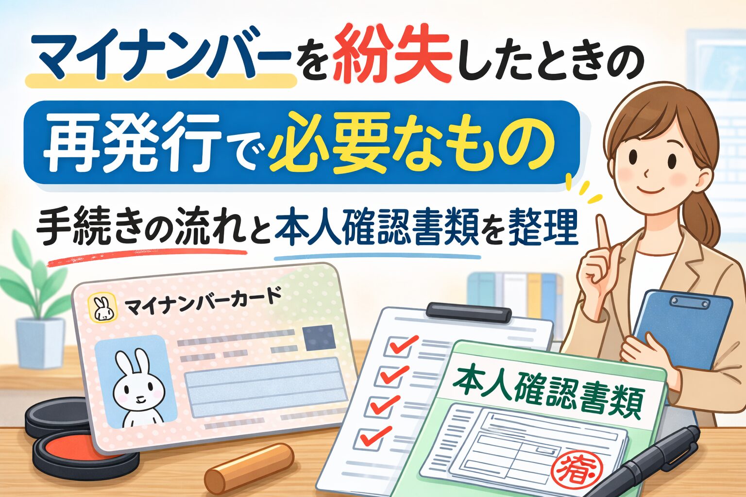 アイキャッチ用:市役所の窓口とチェックリスト、本人確認書類(免許証・資格確認書のイメージ)が並ぶシンプルなイラスト。『紛失』『再交付』『必要なもの』が連想できる無料素材風が望ましい。
