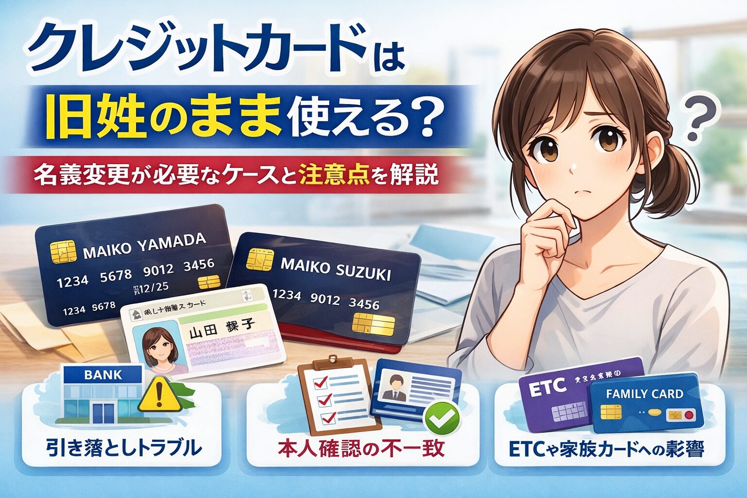 しかし、旧姓のままで使えていることと、その状態が長く安心して続けられることは別です。特に注意したいのは、結婚や離婚で姓が変わったあとに、銀行口座や本人確認書類だけ先に新しい氏名へ変わっている場合です。この状態では、カード会社に登録されている氏名との間にズレが生じます。JCBや三井住友カードの公式案内でも、口座名義変更の順序や名義不一致時の引き落としリスクに注意が促されています。普段の買い物では問題が表に出なくても、引き落とし、再発行、住所変更、利用停止の相談、家族カードやETCカードの手続き、本人確認を伴う各種申請などで、説明や確認が必要になることがあります。